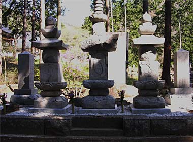 ![]() 上は武田勝頼夫妻と信勝の墓(両脇は殉死者の墓)。 下は辞世の歌碑。 |