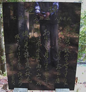 (右から) 北条夫人 黒髪のみだれたる世ぞ はてしなき思ひに消ゆる露の玉の緒 勝 頼 公 おぼろなる月もほのかに雲かすみ はれてゆくえの西の山の端 信 勝 公 あだに見よ誰も嵐の桜花 咲きちるほどの春の夜の夢 境内の桜はほぼ終わっていましたが、NHK大河ドラマ「風林火山」の放映中とあって幟旗や観光ポスターなどが賑やかでした。 説明板によれば武田家は八幡太郎義家の弟、新羅三郎義光の後裔だそうで、その「義光吹笙の石」を去年末の金時山山歩で見たので、これも何となくつながりがあるように感じました。 |