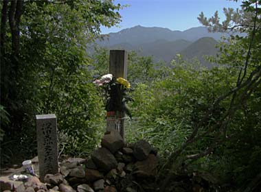 尾根に出てさらに登ると「深田久弥先生終焉の地」という小さな石碑がありました(下)。登り口の公園の説明板によれば、「この辺は(春には)イワカガミが咲いてきれいです」という仲間の説明に喜んで「そうですか」とうなづいたのが最後だったそうで死因は脳出血とのことです。 標柱の上の山は奥秩父の金峰山。 |