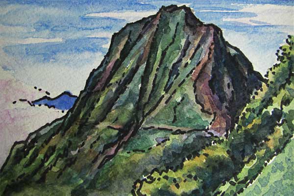 草原にはキャンプ指定地などもあり、「赤横分去(わかさり)」という標識があって、赤岳と横岳への道が分かれていました。壊れかけたバンガローは今も幾つか残っていますが、草原は今は農場や牧場になっています。 波のようにこずえを過ぎる風の音ばかりの単調な道を登っていると、つい昔のことなど思い出してしまいます。 ←1970年9月1日の野辺山原のスケッチ。 この辺は今は「八ヶ岳牧場」になっています。 |