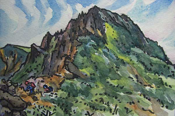 赤岳との中間から見返る横岳→。 下は赤岳との鞍部にある「赤岳天望荘」。 並んだ柱に付いているのは風力発電機のようです。 下右)岩屑だらけの赤岳への登り。 高く見える所は肩といわれる一旦たいらになる部分で頂上は左側の小屋の建つ所です。 その頂上小屋の人がペンキを塗っているのが見えるのですが、これも急斜面で、なかなか近づきません。 |