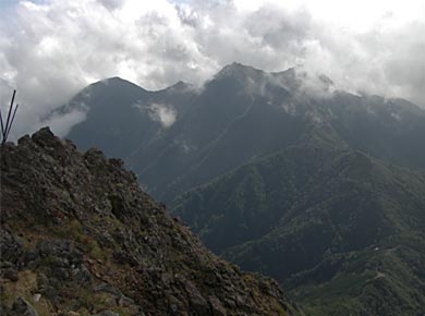 ![]() ↓赤岳の肩から見た阿弥陀岳。この頃から、西風に乗って雲が吹き上げてきて展望が利かなくなってしまいました。 |
