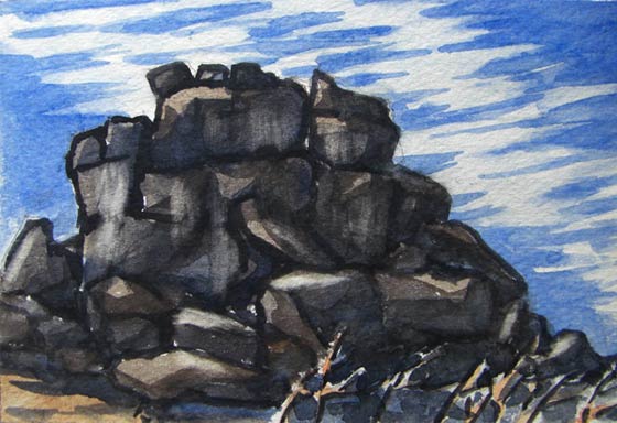 ![]() この日は湿度が高かったのか、富士山など遠くの山は霞んではっきりとは見えませんでした。 城壁のような五丈石のわきに薄く南アルプスの山並みが見えます。 ピラミッドのようなものが見えますが、西側の富士見平に掛けての尾根に、こんなピークが幾つか連なっています。 ピークの向こう側は「千代の吹き上げ」という絶壁になっています。 |