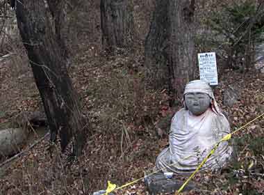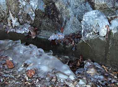 青梅街道の裂石(さけいし)から上日川(にっかわ)峠まで車ではいる予定でしたが、林道が通行止めということで、この間を二時間ほど歩くことになりました→。 歩いたところでは道が崩れた箇所は無く、崩れる前の補強工事のようでした。 下は十五分ほど歩いた所「千石茶屋」というあたりの石仏。 この千石茶屋から登山道があったのですが、見落として車道を歩いたので、傾斜は楽なものの時間は余分に掛かったようです。 この日11月26日は寒波が抜けて気温が上がりましたが、千メートルを越える林道とあって、水がしみ出ている所ではつららが見られます(右下)。 |