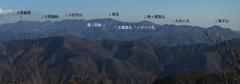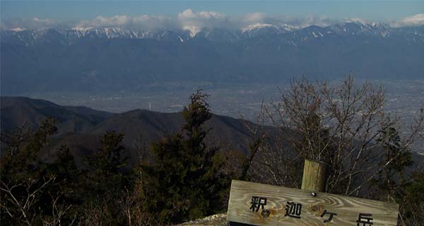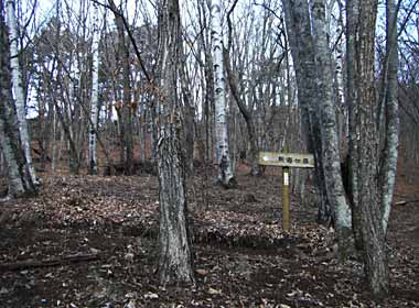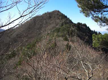 12月21日、河口湖の北、御坂山地を山歩しました。 出発地の「すずらん畑」は、以前は山梨県芦川村だったのですが、最近甲州市芦川町となったようです。 六月頃はスズランの観光地となるようで、山の中ですが林道沿いに鈴蘭灯が立っていました。 川沿いの細長い村で、入口には鶯宿(おうしゅく)という優雅な地名もあります。 駐車場は何か所かありますが、観光案内板のある広い駐車場が釈迦ヶ岳への近道で、すぐ上に尾根への登り口があり(→)、そこから30分も登ると尾根に出ます(↓)。 尾根道はコブを幾つも越えて行きますが、そのひとつ、府駒山を過ぎると、木の間ごしに釈迦ヶ岳が見えてきました(右下)。 |