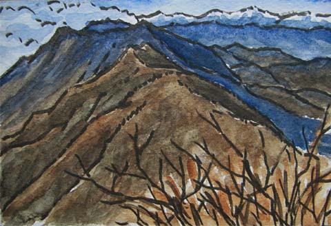 ↓黒岳から節刀ヶ岳へつづく尾根。左端は十二ヶ岳、その右のギザギザしたのが鬼ヶ岳、隣のとがったのが節刀ヶ岳(3月山歩/目次15)です。 ![]() 山頂から右に曲がり、上の尾根を新道峠に向かうはずだったのですが、いい眺めに気を取られて河口湖の方に下りてしまい、だいぶ下りてから気が付いて引き返すことになりました。右上はその道で見たオヤマボクチという草。 |