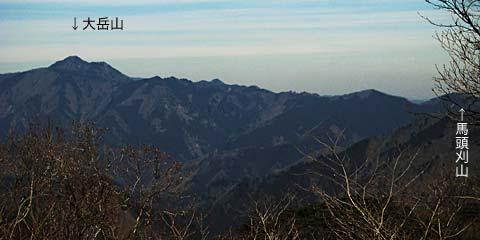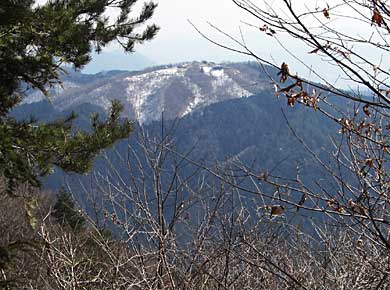西側の展望→。昨年春と秋に山歩した大菩薩方面もだいぶ雪が積もっているようです。 手前は生藤山から延びる尾根で、これから右手をコの字形に廻って、読み方はわかりませんが「登里」という集落に下りることになります。 |