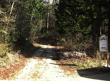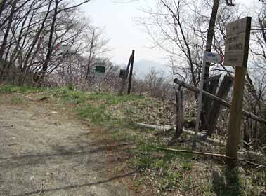 ![]() 二時間ほども歩いてようやく登り口に到着(上右)。林道が、大月から上ってくる登山道(右の手すりがある所)を切る地点です。地図で見ると、大月からここまで五、六時間も掛かるようで、相当歩き甲斐がありそうです。 |