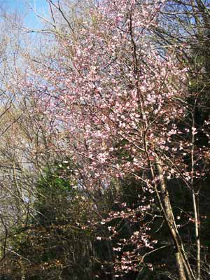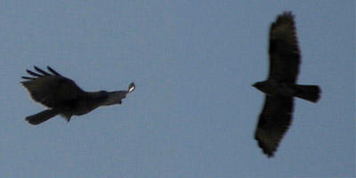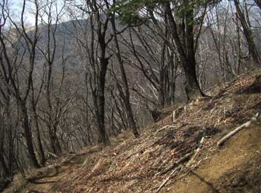 ←この辺はちょうど山桜が咲き始めたところです。![]() 「ピーゥ」といった声が何度か聞こえ、鹿にしては時期がおかしいと思ったのですが、鷹の類の声でした↑。 逆光でよくわかりませんが、ノスリという鷹のようです。 少し上で大峠への林道「真木小金沢線」と別れ、ゲートで閉じられた「奈良子線」にはいります。 |