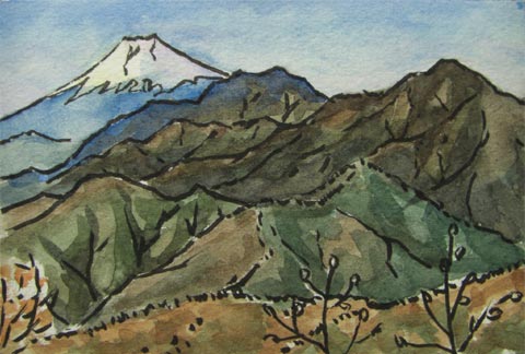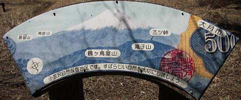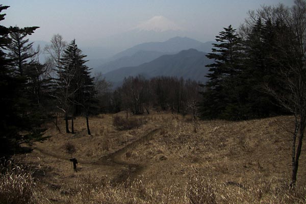 南面が開けるときは富士山も見えます→。富士山の右は三つ峠山、右端は昨年4月、湯ノ沢峠から山歩した滝子山です。 ↓目指す雁ヶ腹摺山も時々見えますが、なかなか登り口に着きません。 |