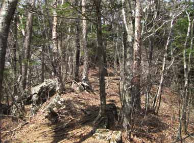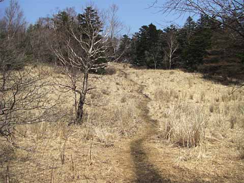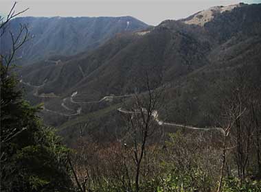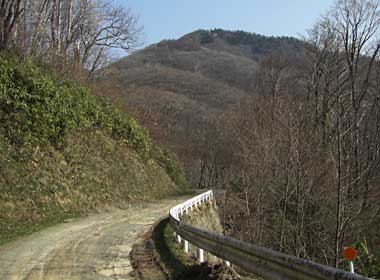 林道は延々と続きますが、山腹に沿って曲がりくねっているので、眺めが入れ替わって厭きません。車は通らないし人通りも無いので、これからの季節は夏鳥の声など聞きながら歩くのによさそうです。 そういえば、渡ってきたばかりらしいツツドリの声がします。 竹筒を手のひらでたたくような音で、いかにも初夏といった感じです。 ←途中の眺め。右の高い山が黒岳で、禿げたのが白谷丸(しろやのまる)、大きく下った所が湯ノ沢峠です。 |