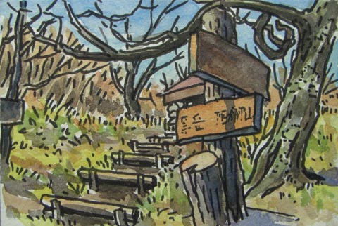 ←山頂にあった展望案内板。赤い印が見えますが、これは二十年ほど前までは見ることができた五百円紙幣の裏側で、図柄はここからの富士山の写真をもとにしているそうです。 名取久作という方が昭和17年11月3日7時15分に撮影と説明がありました。 戦争たけなわの時代ですが、こういう山に登って写真撮影する人もいたのですね。 |