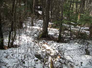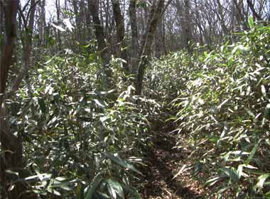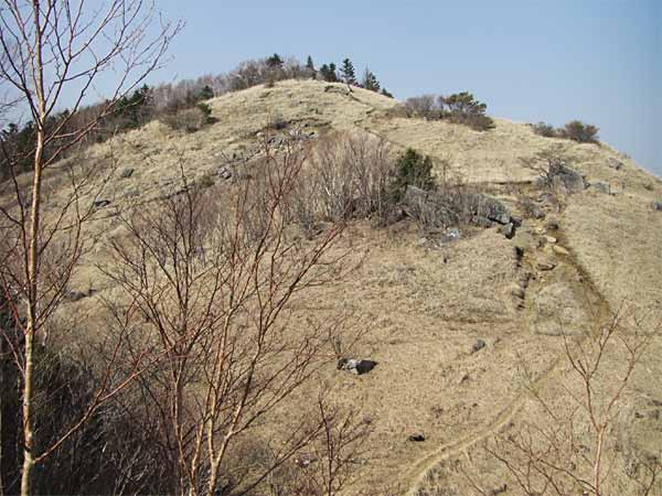 で、その方向の写真ですが→、この日は晴れてはいるものの朝から遠景はぼんやりしていて、富士山もかすみの中といった感じです。名取氏撮影時の11月から早春にかけてが撮影時期のようです。 手前にかぎ形に踏み跡が見えますが、左手から登ってきて、これから右手に下ります。 |