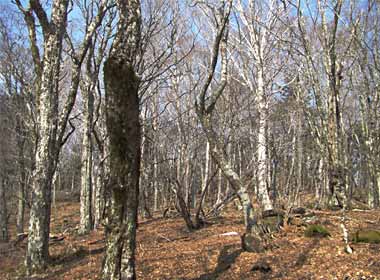 ここから急な斜面を小さなジグザグを切っております↑。← 300mほど下った大峠。 三十何年の昔、五月の連休にこの峠に野宿したことがあるのですが、その頃は林道もなく、この一帯はのびのびとした広い草原で、いかにも大峠という感じでした。 この先は一般車通行止めですが、ここの駐車場からだと腹摺山に二時間ほどで往復できます。 |