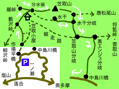 水干分岐に戻り、更に下って笠取小屋から来る巻き道の縦走路に合流、雲取山方向に歩き「黒えんじゅ分岐」↑から中島川橋(右手)に下ります。