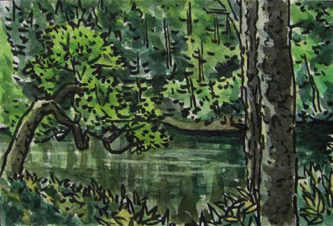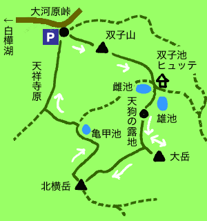 これから亀甲池(見えませんが、右下に当たります)に下り、この原に出て、出発点の大河原峠(右上のたるみ)に戻ります。