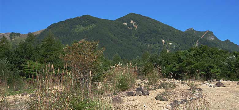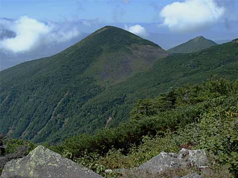 ![]() ↑さらに登ると、林の切れた所から今日の山歩地が全部見えました。左が前三ッ頭(まえみつがしら)、中央が三ッ頭、右が権現岳になります。 |