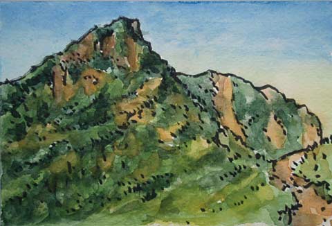 ![]() ↓ちょうど1年前に歩いた赤岳がなかなかの迫力です。左の青い山は雲の陰にはいってつぶれた横岳の岩峰、左に突き出た峰は三叉峰のようです。 歩行時間は8時間余り。 |