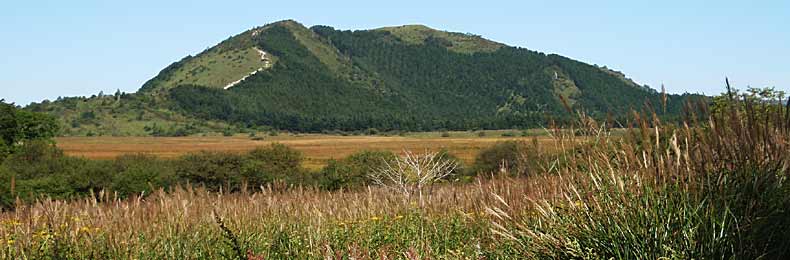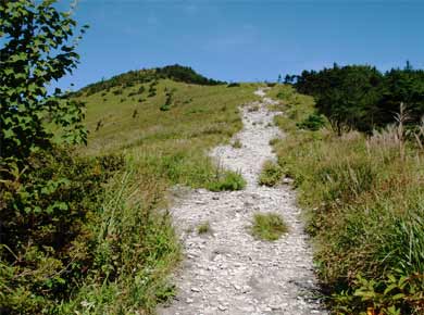 山頂にだいぶ近づいてきました。三ッ頭から見ると、ずいぶん急で転げ落ちそうな感じでしたが、近くで見れば道もあって、何とか登れそうです。 |