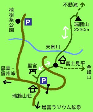 ![]() ↑登り口近くまで下ったあたりで、わずかに道から外れた大きな岩の下に里宮神社がありました。 先の「花崗岩のイマージュ」に、瑞牆山に登る途中この神社に立ち寄る話があります。 その頃は床下に泊まれるくらいの社殿であったようで、前の狛犬の口が欠けている訳を同行の案内人に聞くと、「夜中になると這(へ)え回るんで、こう擦り切れたんだっていうね」と真顔で答える──というので、この犬を見たいものだと思ったのですが、その石像はありませんでした。 その後、神社は荒廃して、現在の社殿は昭和45年に造られたということです。 ↓帰りがけに立ち寄った「植樹祭公園」からの瑞牆山の眺め。 右から2番目のピラミッド形が、下りてきた山頂のようです。 歩行時間は5時間半ほど。 |