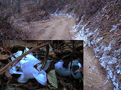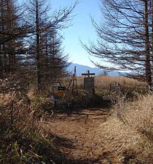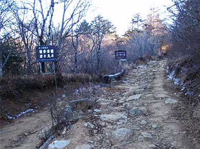 ここから山頂下まで、頑丈な車なら通れるような急傾斜のでこぼこ林道↑を登るので、自然な山道を好む人にはつまらないルートです。↑数日来の冷え込みが幾らか緩んだものの、林道には15センチほどの霜柱が立っていました。 ↑写真内左下はカタカナで表記するシモバシラ。倒れかかっている茎がその名前の草で、枯れた茎が毛細管になって吸い上げた水が凍り、アメ細工の延ばしたアメのように、波打った氷がリボン状に延び出てきます。 1時間ほど歩くと道が左右に分かれます(右上)。 どちらも最高所の開運山に行くのですが、右側に少し外れた木無山に寄って行くので、右を取りました。 |
