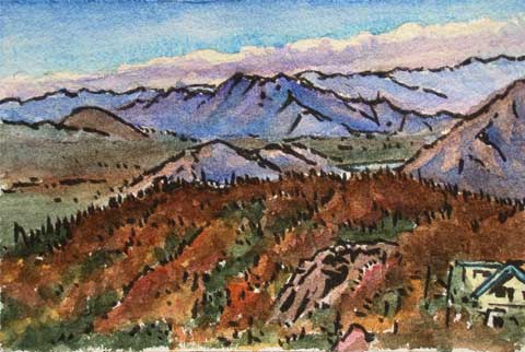 その下が先の林道を上下する車。三ツ峠山荘の案内には高齢者や写真用器材などは車での搬送もできるとありました。泊まり込みで富士山撮影の人も多いからでしょうか。岡田紅陽という写真家も山荘の常連客だったそうです。