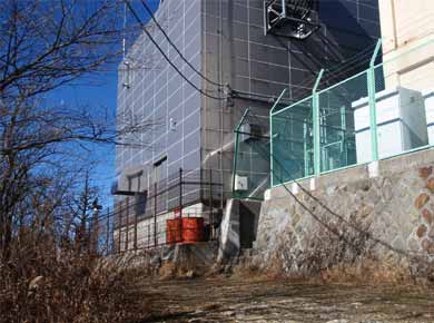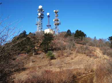 ↑山頂下から。三ツ峠は電波中継の適地なのか、アンテナの山としても有名です。高い所にアンテナ群があるので宇宙関係の基地のような感じです。上右は開運山山頂。