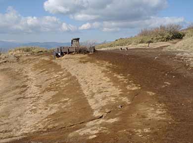 火山性の赤土なので、午後の帰りには霜どけで、どろどろになりました。凍った残雪などの用意に持っていた、靴の土踏まずに付ける簡単なアイゼンを使ってみると、霜どけの斜面の滑り止めにもこれが結構役立ちました。
