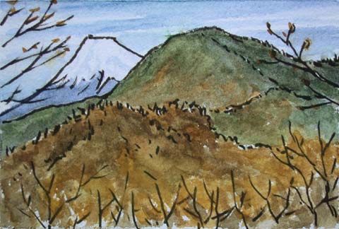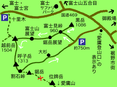↑は、呼子岳付近からの北側の眺め。越前岳と富士山が並んで見えます。呼子岳↓は道の脇の出っ張りといった感じの狭い山頂です。