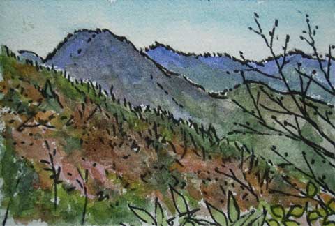 ![]() ↓峠から東側の眺め。高い所は大笄(おおこうげ)。笄はコウガイで、結った髪を留めるクシだそうです。その右手が桧洞丸。 ![]() |