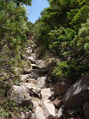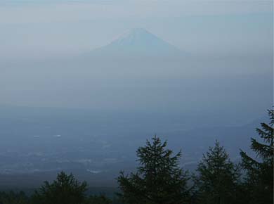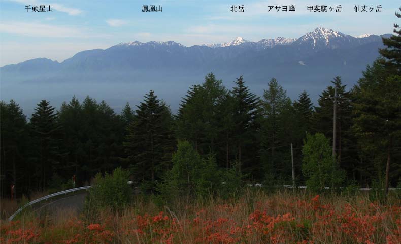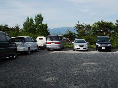 八ヶ岳南部はアルプス風のギザギザした岩山が連なっていますが、南端の編笠山は名前のとおりに単純な台形の山です。登り口の観音平への途中に南側の開けた展望地があって、南アルプスの眺めが見事でした↑。 ↓富士山も秋から冬のようではありませんが、何とか見えます。 ![]() 南麓の観音平(1580m)まで舗装道路があり、終点が駐車場↑になっていますが、そこで交通整理のような事をやっているので、そんなに混雑するのかと思ったら、ちょうどその日、地元の小淵沢小学校の登山があったようです。 |