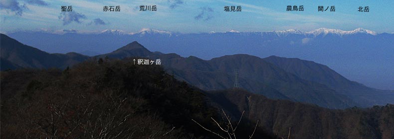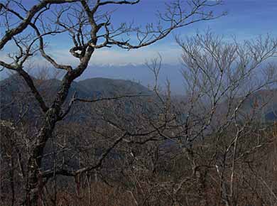 ←清八山からの黒岳(左)と釈迦ヶ岳(右のピラミッド形)。このあたりの山は尾根でつながっていて、清八山もその尾根のコブのひとつで、特に登頂の対象になる山ではありませんが、山頂は尾根上の見晴台のようです。 |
