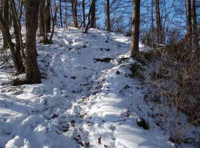 ![]() ↑トンネルの少し上、道坂峠。右手は御正体山(みしょうたいさん)、左が今倉山への道になります。↑登るほどに雪が増えてきます。 |