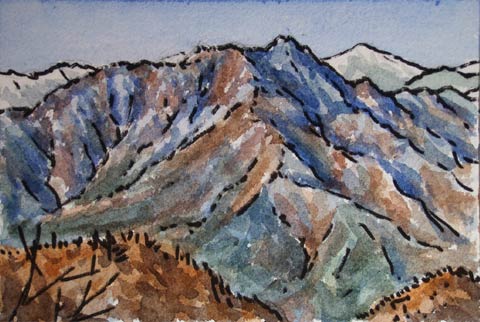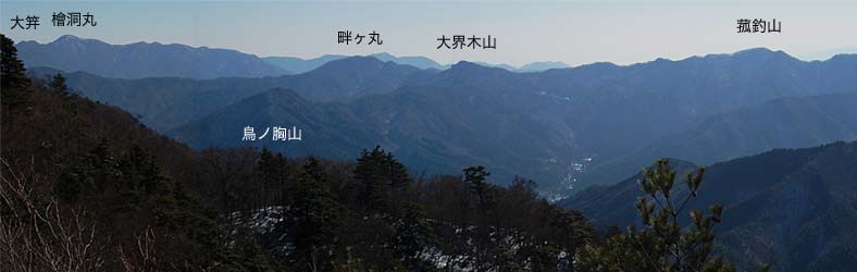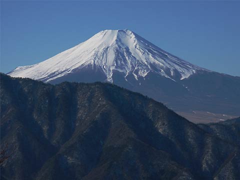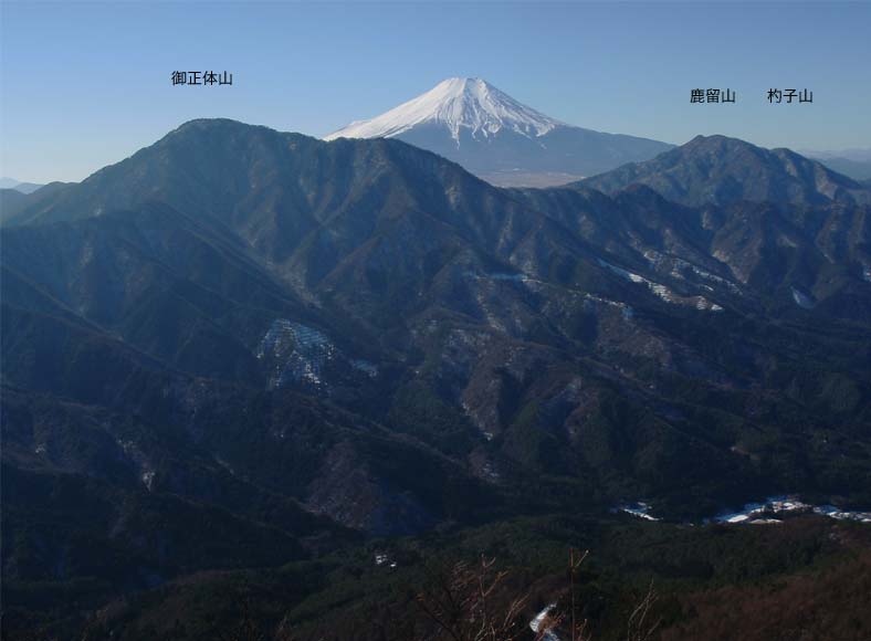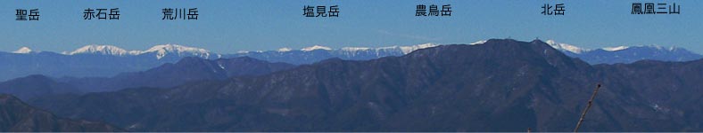 ←西峰からの三つ峠山。右側の白い山は赤石山地の北岳。 |