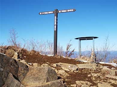 山頂は双耳峰といった形で東西ふたつに分かれ、西峰の端の岩からはようやく見晴らしが開けて、富士山や南アルプスなどが見えます→。 |
