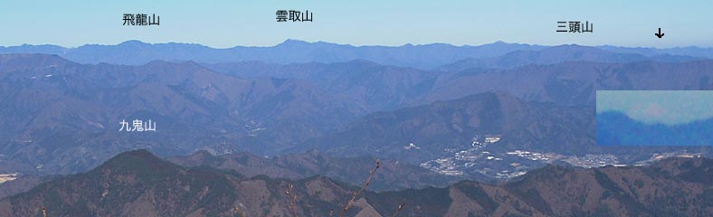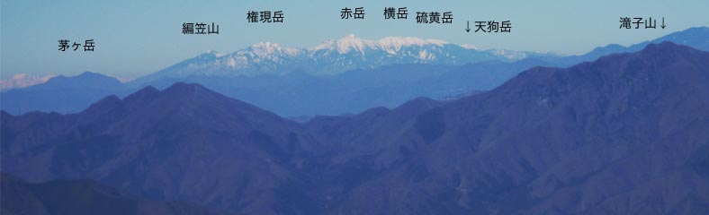 ![]() ↑西側、正月休みに遭難事故のあった聖岳(ひじりだけ)から鳳凰山まで見渡せます。農鳥岳と北岳の間を隠す山が三ツ峠山です。 |
