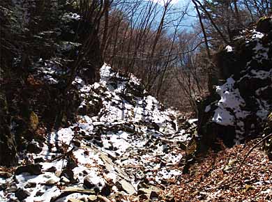 ![]() ↑西峰を下った、地図に西ヶ原とある所。帰りはここから沢沿いに下ります。↑そこから西へ少し登り返すと赤岩というピークに出ました。道標には「松山(赤岩)」となっています。 |