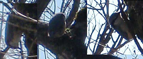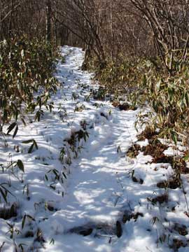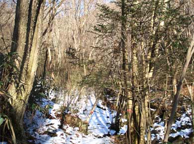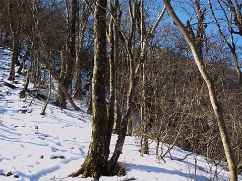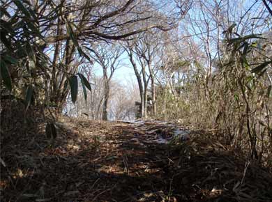 ↑植林や雑木林などが入り混じる道を行きます。この日は季節はずれの暖かさで、帰りにはこの辺の雪は融けていました。このあとジグザグの道を登って端足峠(上右)に出ます。 |