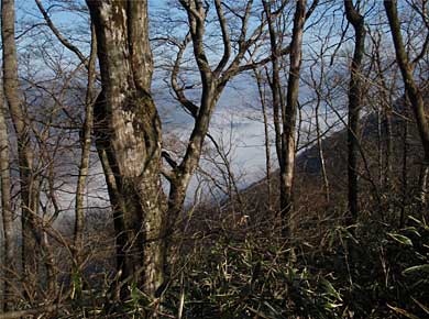 本栖湖畔の竜ヶ岳は、近年富士山頂に上る初日を見る山のひとつとして知られるようになってきました。その竜ヶ岳から南の田貫湖畔の天子ヶ岳まで続く尾根には幾つかの山がありますが、両端と、中ほどの毛無山の他はあまり登られない山で、熊笹の茂る歩きにくい尾根道だったそうです。 山梨県が竜ヶ岳周辺の登山道を整備したついでに隣の雨ヶ岳(あまがたけ)まで笹を刈ってくれ、今は歩きやすくなったというので、今回はその雨ヶ岳に登ってみました。 富士宮市の根原から端足(はした)峠に向かうのですが、入口は何の表示も無い林道で、車が高速で行き交う国道から探し当てるのは至難の業といった感じです。 結局、近くのガソリンスタンドで教えてもらいました。 神社の脇のゲートをはいり、別荘風の建物やら椎茸の栽培地などがある暗い杉林の中を行きます→。 |