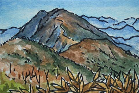 ![]() この山は安倍川を取り巻く形で連なる尾根の東側の高みのひとつで、南アルプス南部の山と向かい合う形ですが、西側の尾根にさえぎられて頭が見える程度です↑。 |