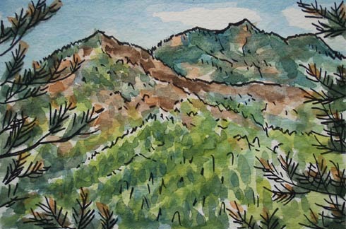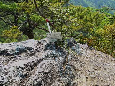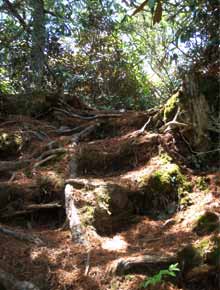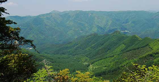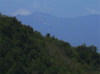 ↑林道の終点から支尾根の山道にはいり、カラマツの植林帯を登ります。ここは丸太の階段が断続する歩きにくい道です。上右は林の切れ目から見える御座山。右奥が山頂のようです。 |