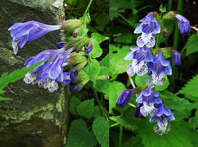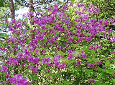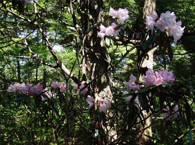 ↑ラショウモンカズラ。渡邊の綱という武人が羅城門で切り落とした鬼の腕の形ということです。草の花はまだ少ないようです。上右はミツバツツジ。 |