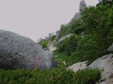 ↑地蔵ヶ岳の岩壁。薬師岳まではこの花崗岩の崩れた白砂の道です↑。