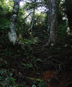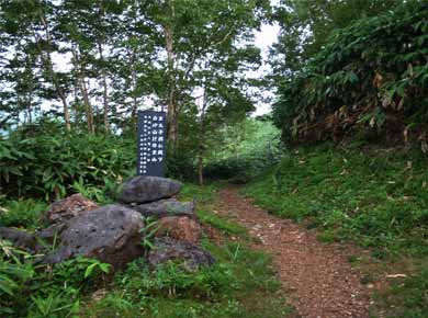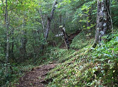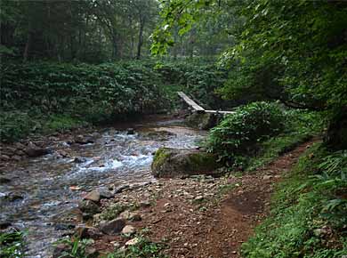 ![]() ↑登り口。平成八年、皇太子殿下が登山されたという記念の碑が建っています。↑ハンノキ沢。 |