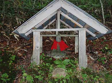 ![]() ↑地蔵峠の道標。上が白砂山方向、左は野反ダムからの谷川沿いに山腹を巻いて切明(きりあけ)に出る道。↑は峠のお地蔵様。群馬から秘境・秋山郷にはいる昔からの道だったようです。 |