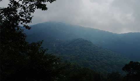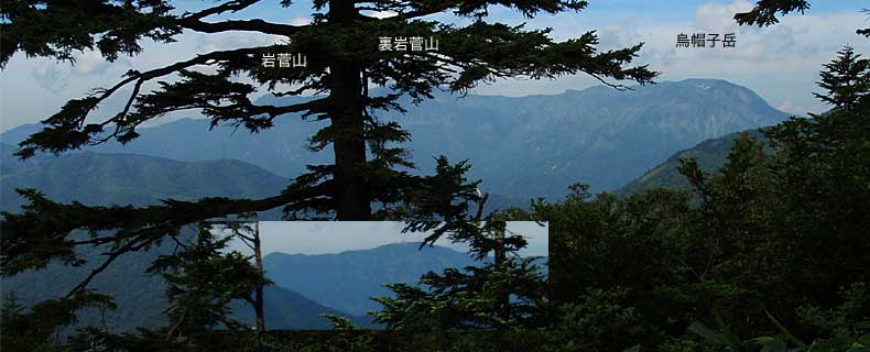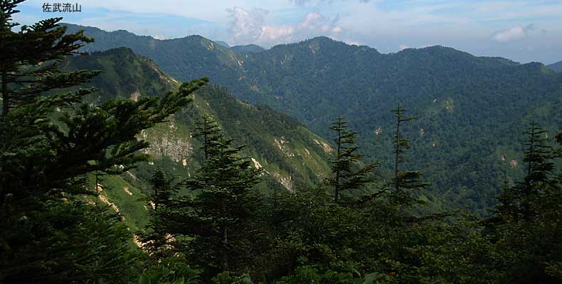 切明には今はテニスコートがあるとかいうことですが、三十何年の昔、鳥甲山(とりかぶとやま)に登るのに通った時には切明には無人の発電施設があるばかりで、「カゴ渡し」という物も残っていたと思います。当時橋ができていたので使うことはありませんでしたが、深い谷に渡したロープに滑車つきの駕篭が掛けてあり、これに乗り引き綱を引いて対岸に渡るといったものでした。 ←これから越える堂岩山。 このところ猛暑が続く割には雲が多く、午前中から雲が掛かってきました。 |