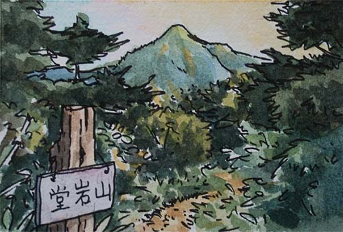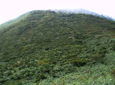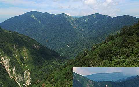 ![]() ↑堂岩山への登りの途中、木の間越しに見た岩菅山方面。何かで読んだ話ではイワスゲという植物はないそうで、この尾根が岩だらけでなので「岩がすげェ山」から岩菅の字を当てたのだとか。 |
