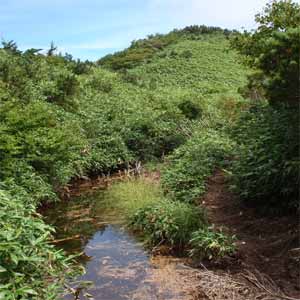 ![]() ↑地蔵峠からは地蔵山、堂岩山と階段状に越えていく形で、標高差の割にはくたびれる道です。↑は堂岩山下のちょっとした平坦地から見た野反湖。ここから後側に5分ほど歩くと沢の水場に出られるので幕営によさそうです。 |