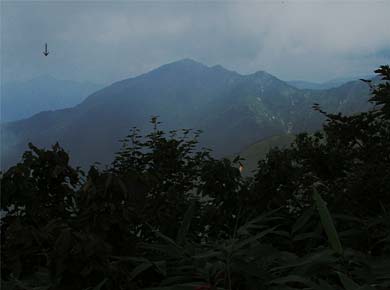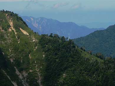 ↑この尾根の標高は2000mほどですが、冬の季節風や積雪が多いようで、シャクナゲ、ダケカンバ、ハイマツといった低木と笹原で、中部山岳の森林限界あたりの感じがします。↑は佐武流山(左端)と、その尾根の鞍部から覗く苗場山(中央/右下はその拡大)。