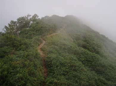 ↑堂岩山から少し下った分岐。上が堂岩山、手前が白砂山、左手は八間山を経て野反湖に下りる道。↑一旦おりた所から見上げる堂岩山。南(左側)から雲が吹き上げてくるようです。